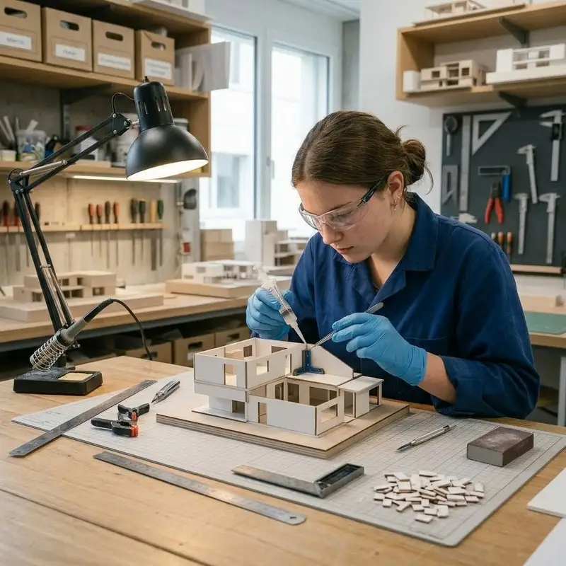 Als Architekturmodellbauer/in EFZ baust du kleine Modelle von Gebäuden, Brücken oder Landschaften. Du sägst, schleifst und schneidest dafür verschiedene Materialien zu und klebst sie dann zusammen. Mit Schrauben und Löten sorgst du dafür, dass alles gut hält 🏗️🔧