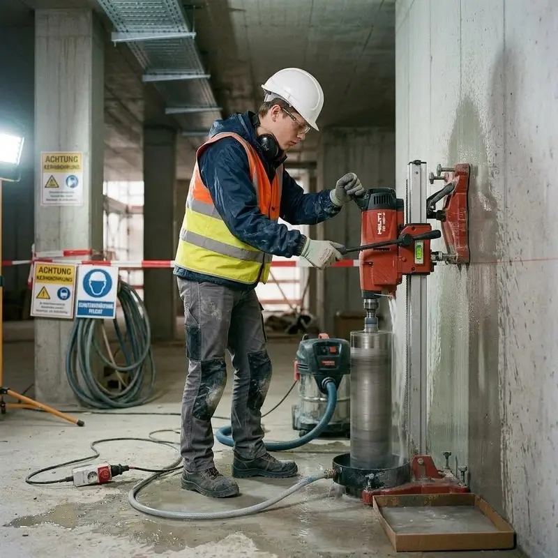 "description": "Du bohrst mit der Kernbohrmaschine tiefe Löcher in Beton oder Stein, während Wasser zur Kühlung läuft.",