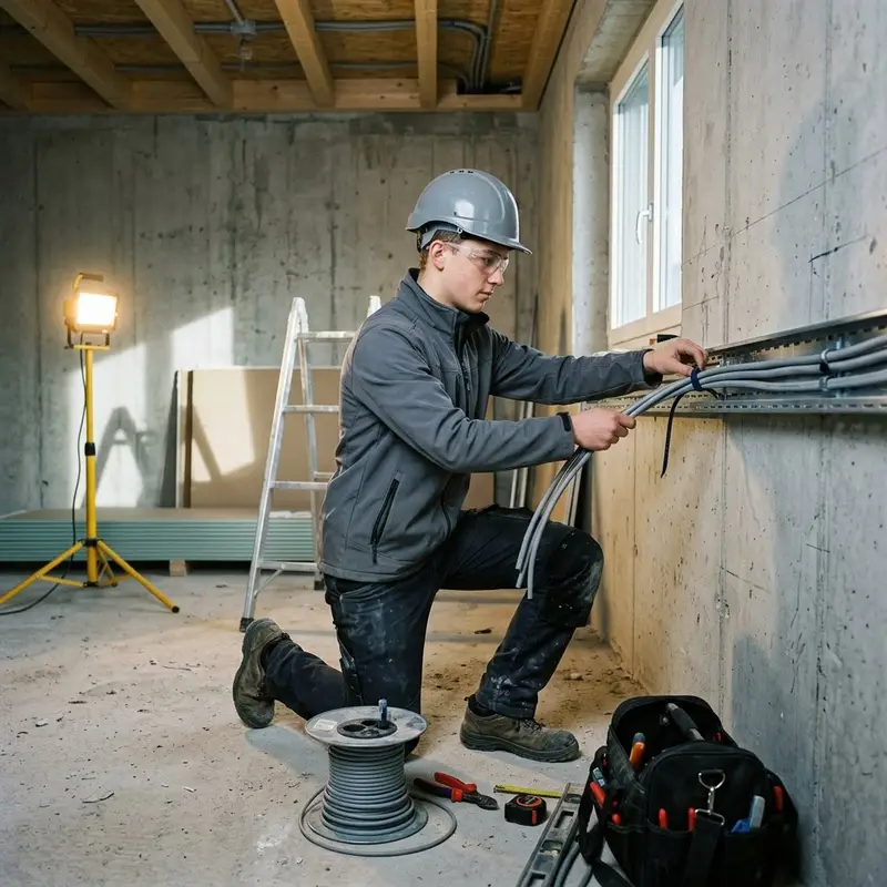 "description": "Du verlegst Stromkabel in Wänden und Decken einer Baustelle und befestigst sie in Kabelkanälen.",