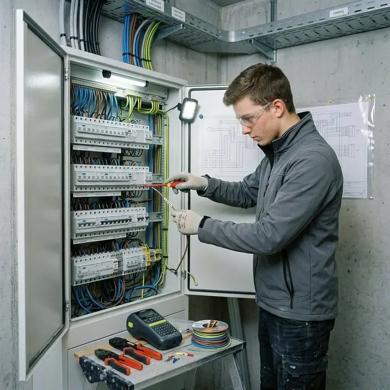 "description": "Du verdrahtest im Elektroverteiler die Sicherungen und Klemmen mit den passenden Drähten nach Plan.",