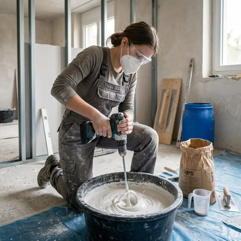 "description": "Du mischst Gips und Wasser in einem Eimer mit dem Rührquirl auf der Baustelle, bis die Masse cremig ist.",