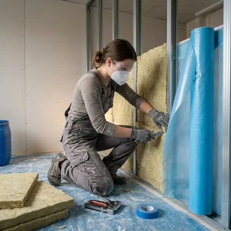 "description": "Du klemmst Mineralwolle in eine Ständerwand und deckst sie sauber mit Folie ab, bevor du sie verschliesst.",