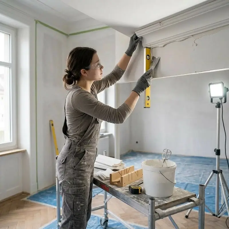 "description": "Du setzt Stuckprofile mit Spachtel und Klebemörtel an eine Decken-Kante und richtest sie mit der Wasserwaage aus.",