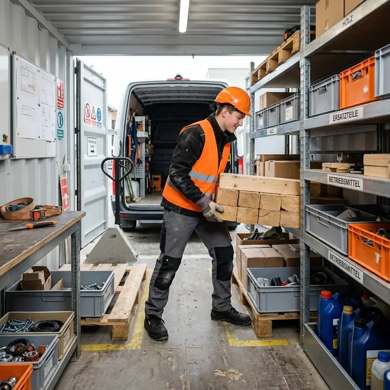 "description": "Du lädst Holz, Ersatzteile und Betriebsmittel vom Lastwagen ab und sortierst alles im Baustellenmagazin in Regale und Kisten.",