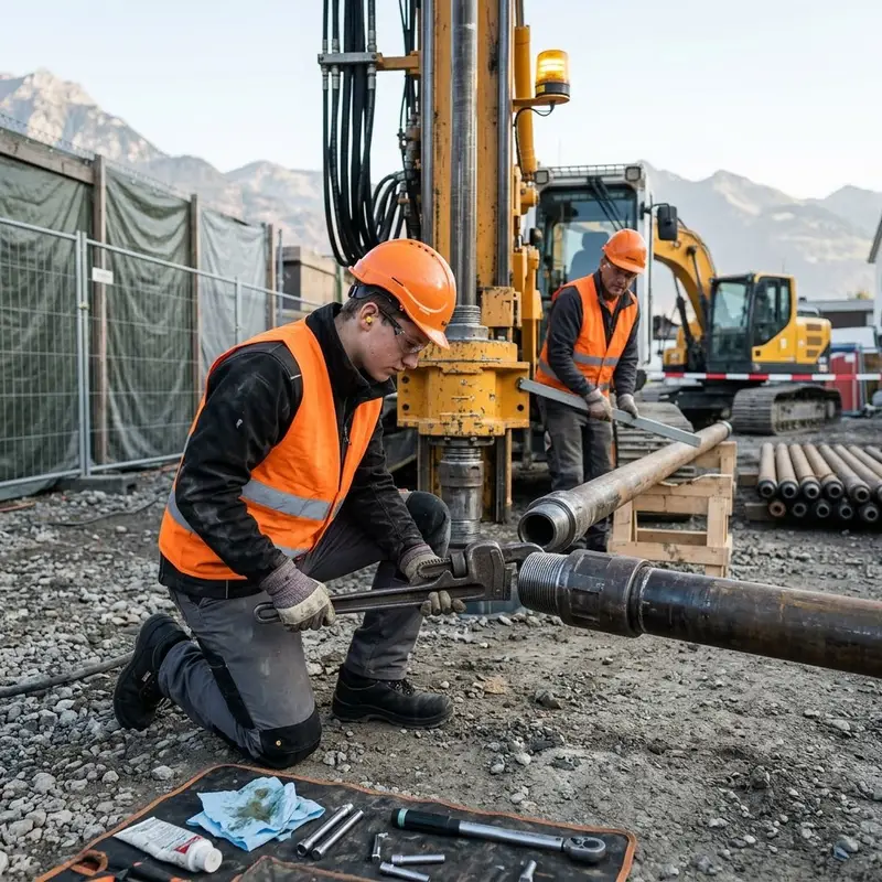"description": "Du montierst mit deinem Team eine Bohranlage auf der Baustelle und verbindest Bohrgestänge und Bohrkopf mit Werkzeugschlüsseln.",