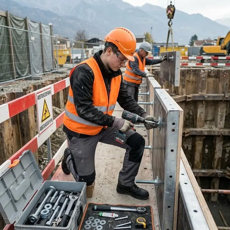 "description": "Du stellst Betonschalungen und Stützelemente an der Baugrube auf und fixierst sie mit Spannankern und Schrauben.",