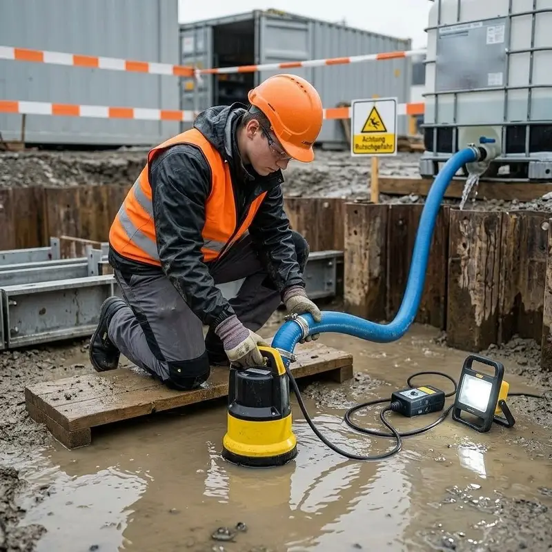 "description": "Du legst eine Tauchpumpe in die Baugrube, schliesst Schläuche an und pumpst das Wasser in einen Sammelbehälter ab.",