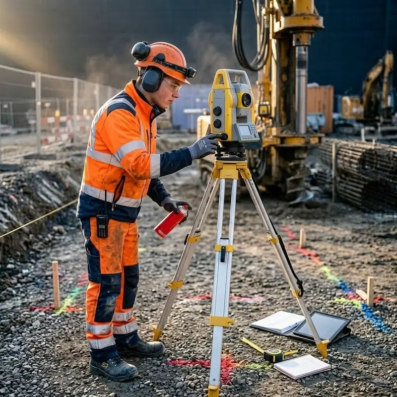 "description": "Du stellst ein Messgerät auf und misst auf dem Bauplatz die genauen Bohrpunkte mit Markierspray an.",