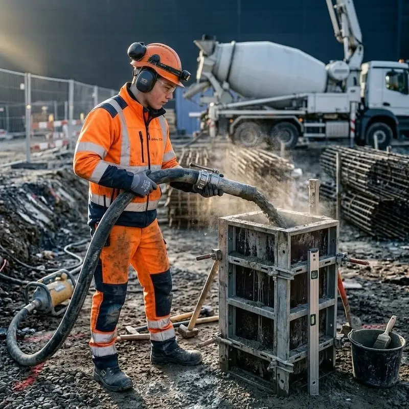 "description": "Du montierst eine Schalung aus Holz oder Stahl und füllst sie auf der Baustelle mit Beton aus dem Schlauch.",
