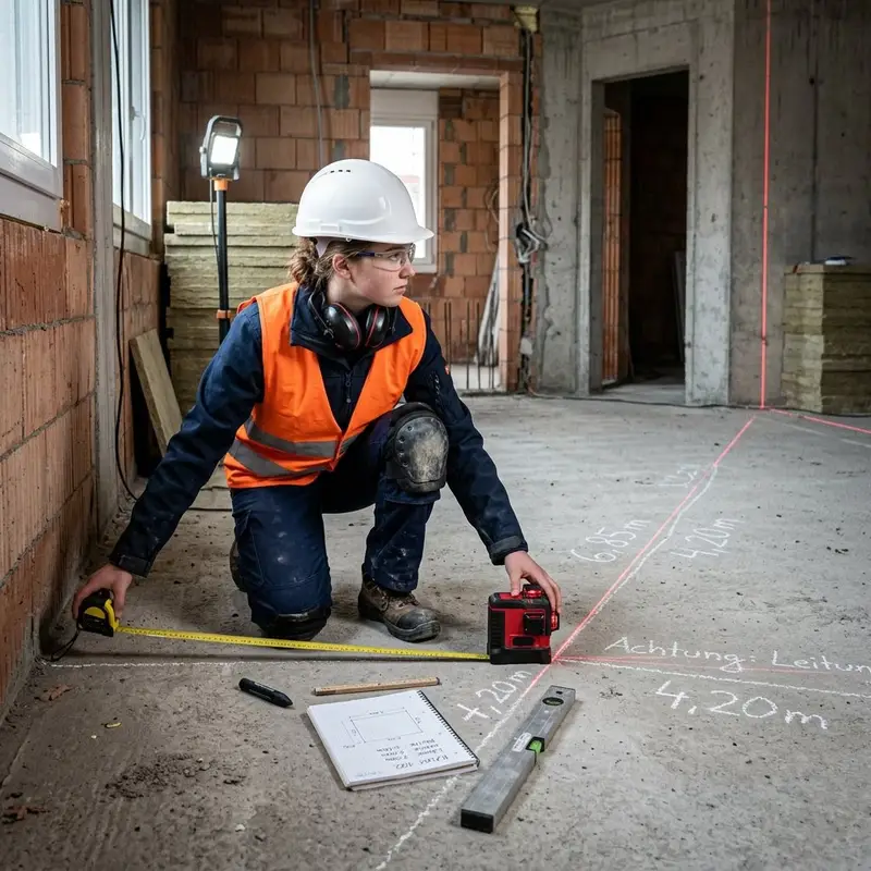 "description": "Du misst mit Massband und Laser die Bodenfläche im Rohbau aus und markierst die Masse auf dem Untergrund.",