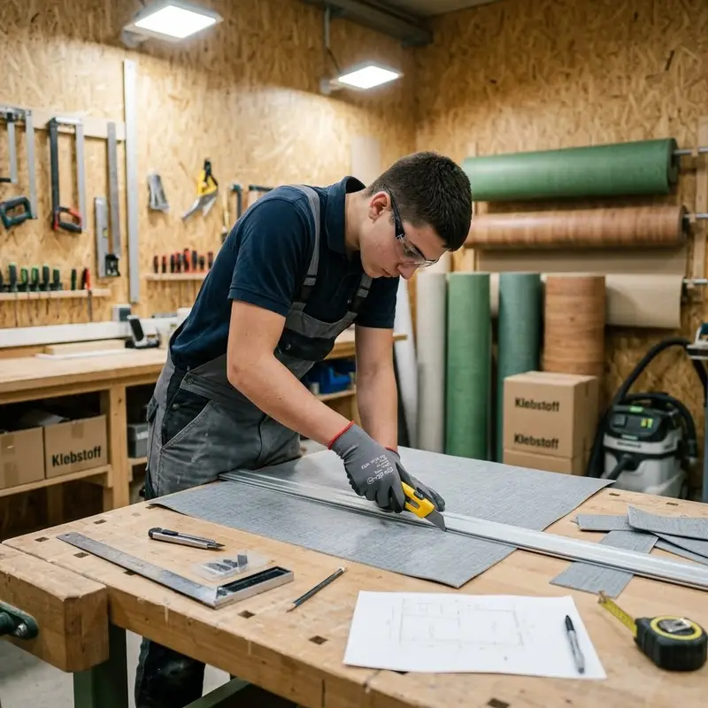 "description": "Du legst die zugeschnittenen Bahnen im Raum aus und richtest sie an Wänden und Kanten faltenfrei aus.",
