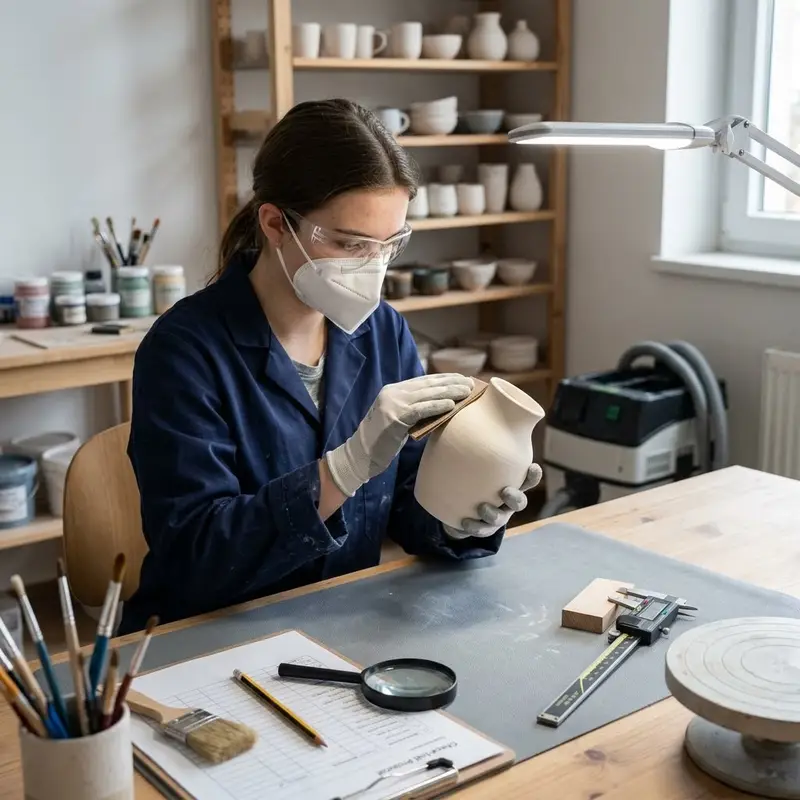 "description": "Du schleifst oder bemalst die gebrannten Keramikteile am Arbeitstisch und kontrollierst sie danach auf Risse und Maßhaltigkeit.",