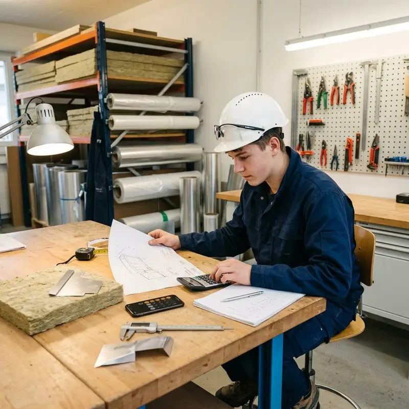 "description": "Du berechnest am Arbeitstisch in der Werkstatt die benötigten Mengen an Dämmstoff, Metallblechen und Folien für ein Gebäude.",
