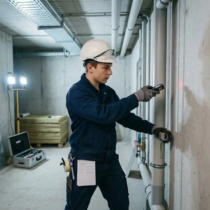 "description": "Du misst auf der Baustelle mit Massband und Laser die Flächen und Rohrleitungen aus, die du isolieren willst.",