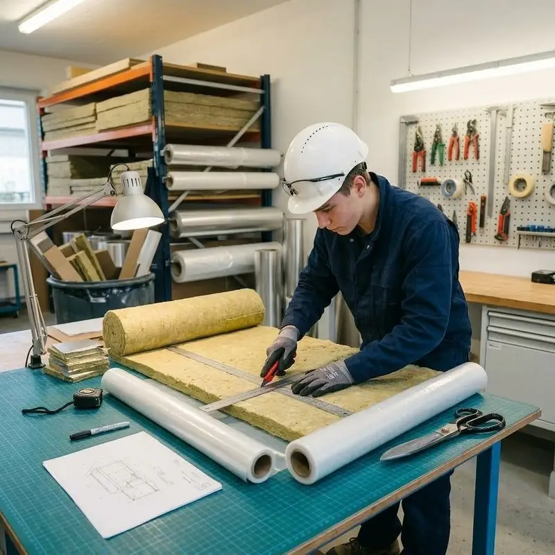 "description": "Du schneidest in der Werkstatt Dämmmatten und Folien mit Messer und Schere exakt auf die gemessenen Masse zu.",
