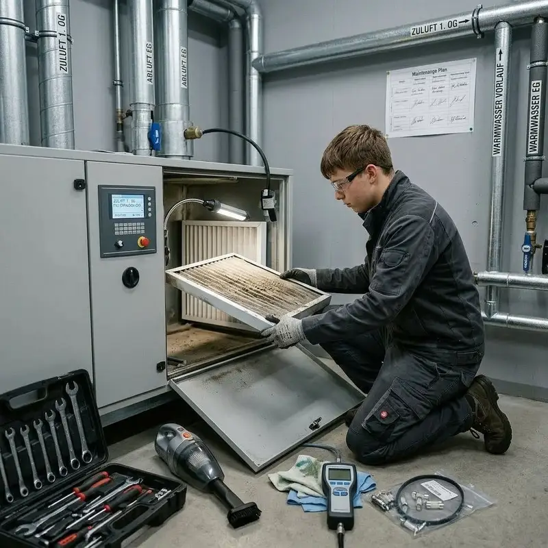 "description": "Du öffnest die Lüftungsanlage im Technikraum, reinigst Filter und Kanäle, tauschst defekte Teile aus und prüfst die Funktion am Bedienfeld.",