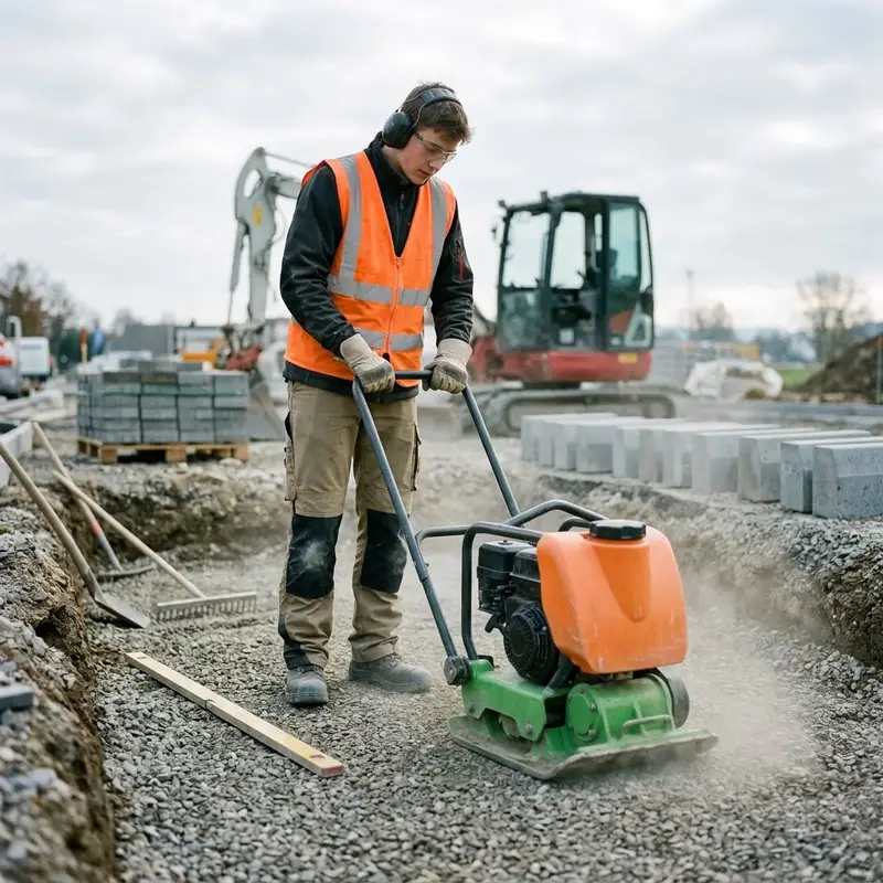 "description": "Du hebst den Untergrund aus, verteilst Kies und verdichtest ihn mit der Rüttelplatte auf der Baustelle.",