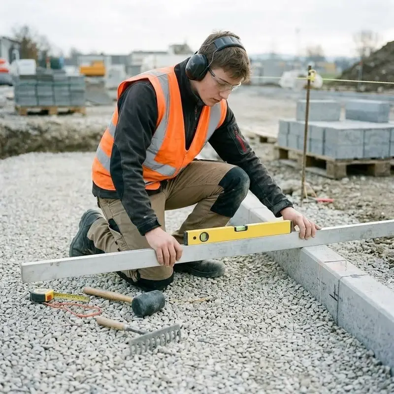 "description": "Du ziehst die Bettung mit Richtlatte und Wasserwaage ab und stellst Gefälle und Höhe am Randstein ein.",