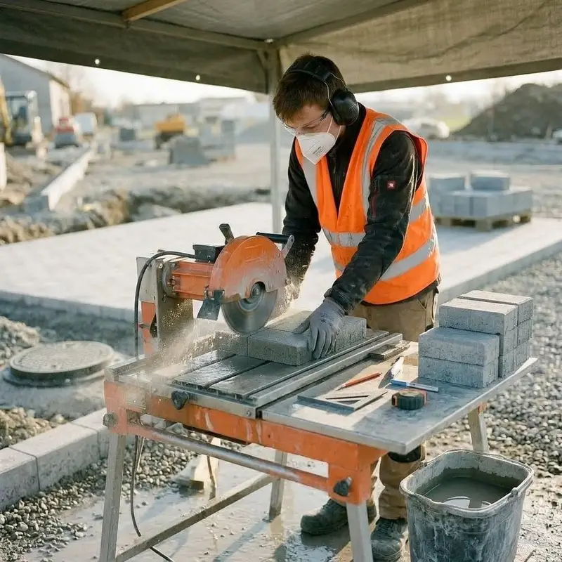 "description": "Du schneidest Pflastersteine mit der Steinsäge passend zu Kanten und Schächten zu.",