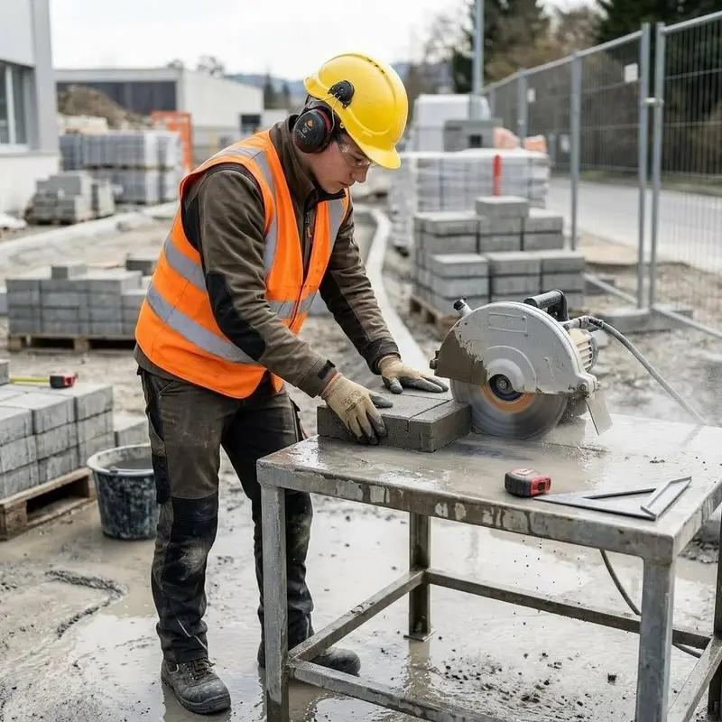 "description": "Du schneidest Pflastersteine mit der Steinsäge so zu, dass sie genau in eine Lücke passen.",