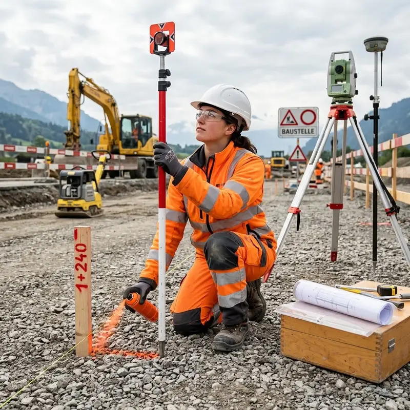 "description": "Du misst mit Messgerät und Markierspray das Gelände aus und steckst den genauen Strassenverlauf auf der Baustelle ab.",