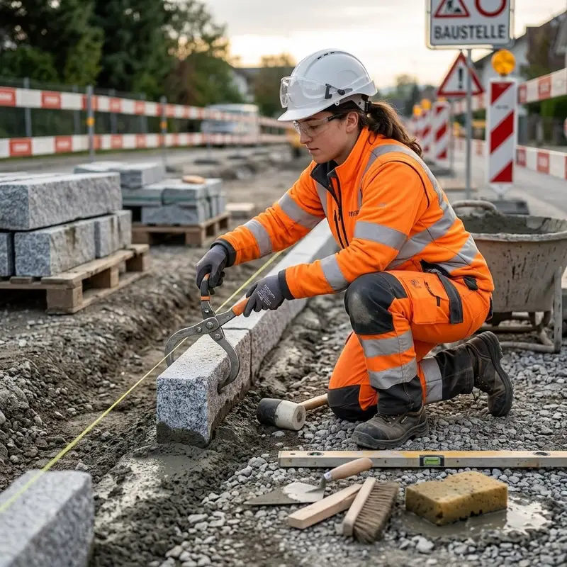 "description": "Du setzt Randsteine mit Zange und Gummihammer in das Mörtelbett entlang der Strassenkante.",