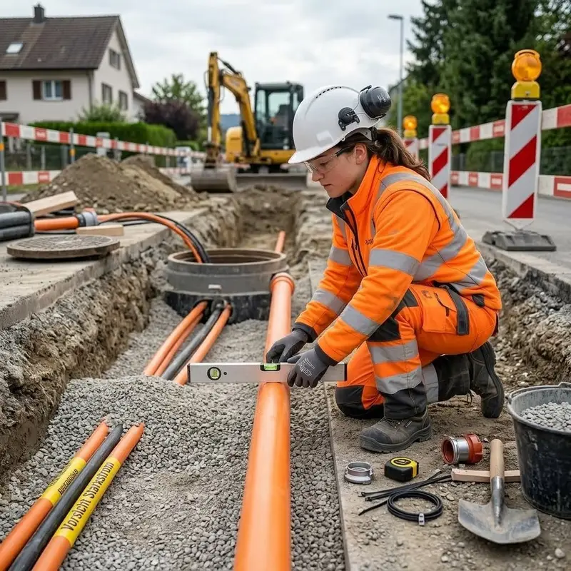 "description": "Du legst Rohre und Kabel in einen offenen Graben, richtest sie mit Wasserwaage aus und deckst sie mit Kies zu.",