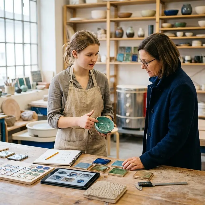 "description": "Du berätst Kundinnen und Kunden in der Werkstatt und zeigst ihnen Musterstücke, damit sie Form, Farbe und Einsatz der Keramik auswählen.",