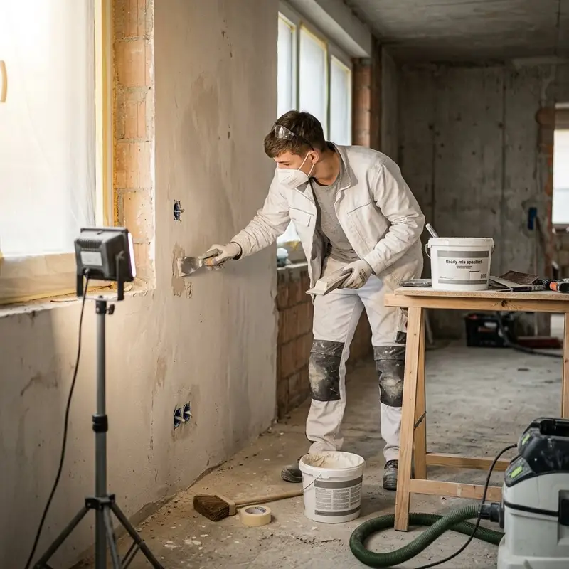 "description": "Du schleifst und spachtelst eine Wand auf der Baustelle, bis die Oberfläche glatt und sauber ist.",