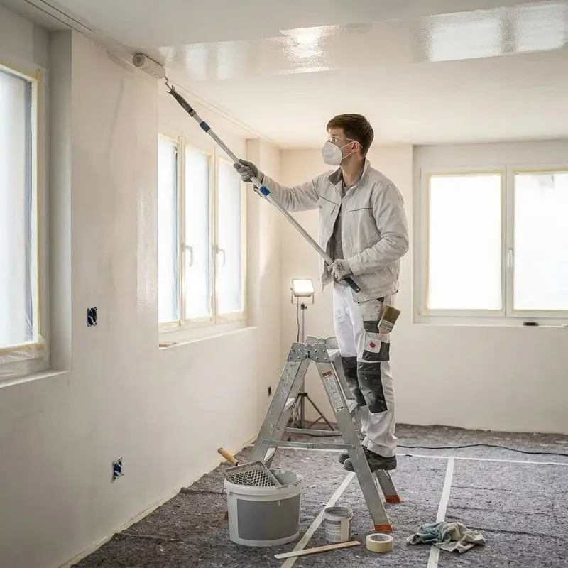 "description": "Du rollst Grundierung mit Rolle und Pinsel auf Decken und Wände im Innenraum, damit die Farbe gut haftet.",