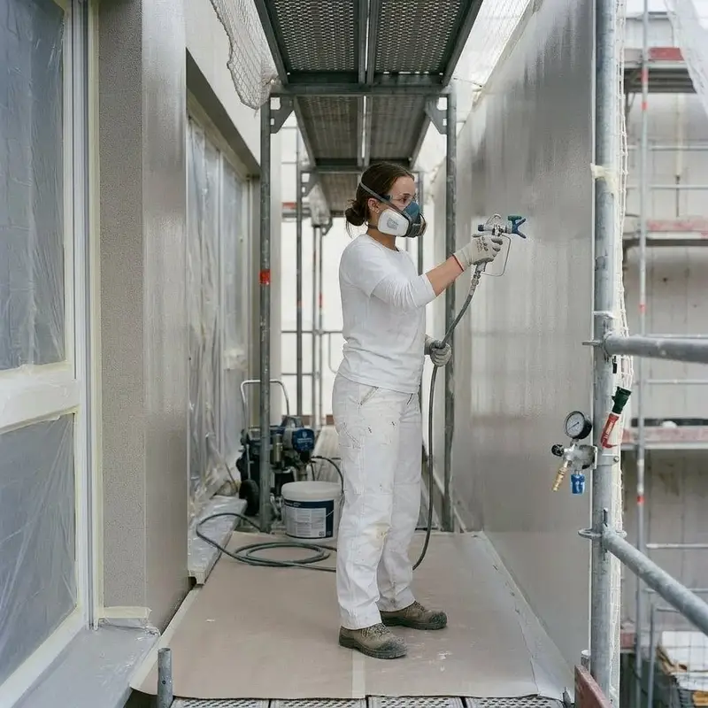 "description": "Du spritzt mit der Spritzpistole gleichmässig Lack auf eine grosse Fassadenfläche und deckst Fensterrahmen mit Folie ab.",