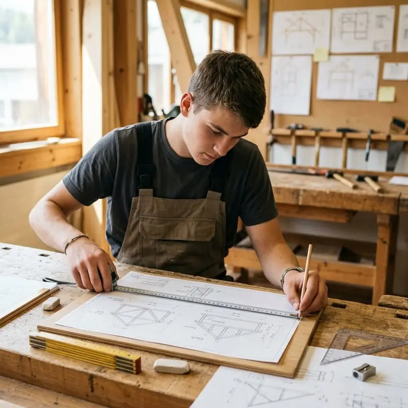 "description": "Du zeichnest am Arbeitstisch einen Bauplan mit Massband und Bleistift auf Papier.",