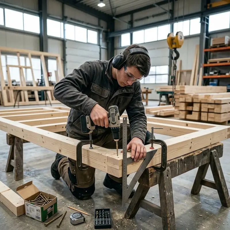 "description": "Du montierst in der Werkhalle einen Holzrahmen, indem du Balken mit Bohrmaschine und Schrauben verbindest.",