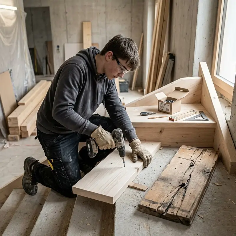 "description": "Du ersetzt auf einer Baustelle ein beschädigtes Treppenbrett, indem du das alte Teil herausnimmst und ein neues verschraubst.",