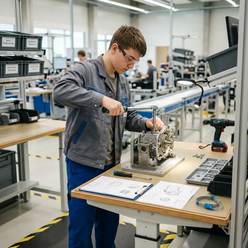 "description": "Du montierst mechanische Teile und Baugruppen mit Schraubendreher und Drehmomentschlüssel in der Montagehalle zu einem Gerät.",