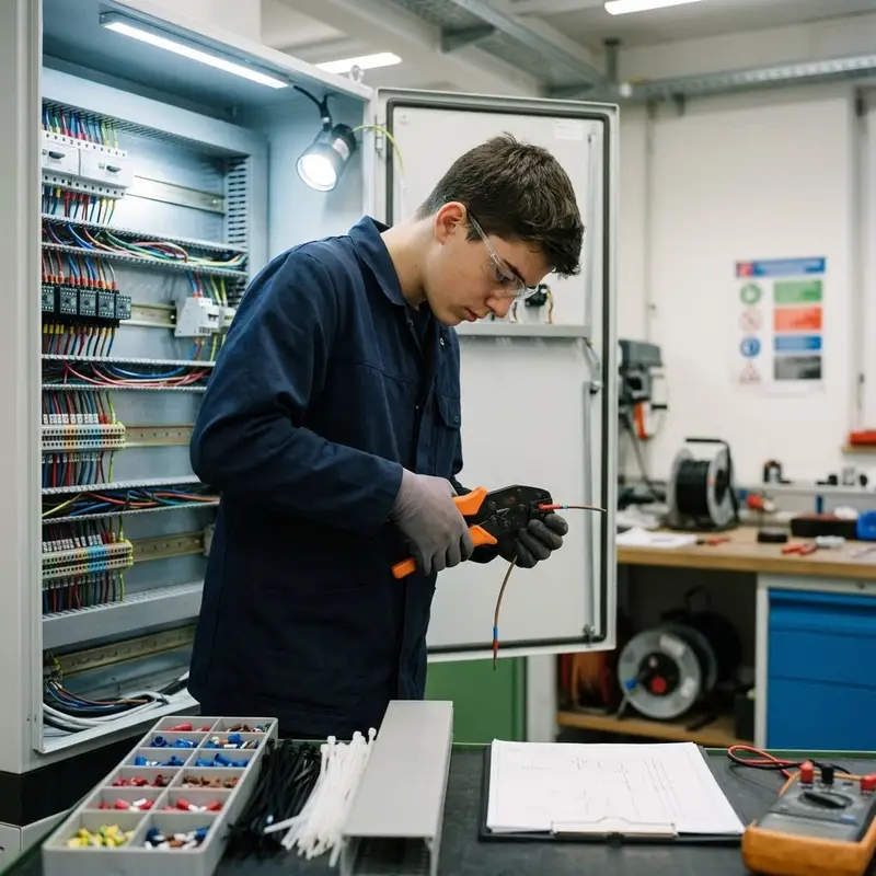 "description": "Du verdrahtest Klemmen, Sensoren und Aktoren mit Abisolierzange und Crimpzange in einem Schaltschrank.",