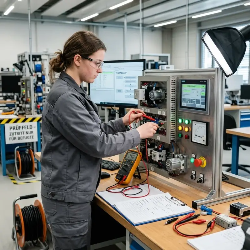 "description": "Du prüfst die fertige Anlage mit Multimeter und Prüfgerät am Teststand und beobachtest die Anzeigen.",