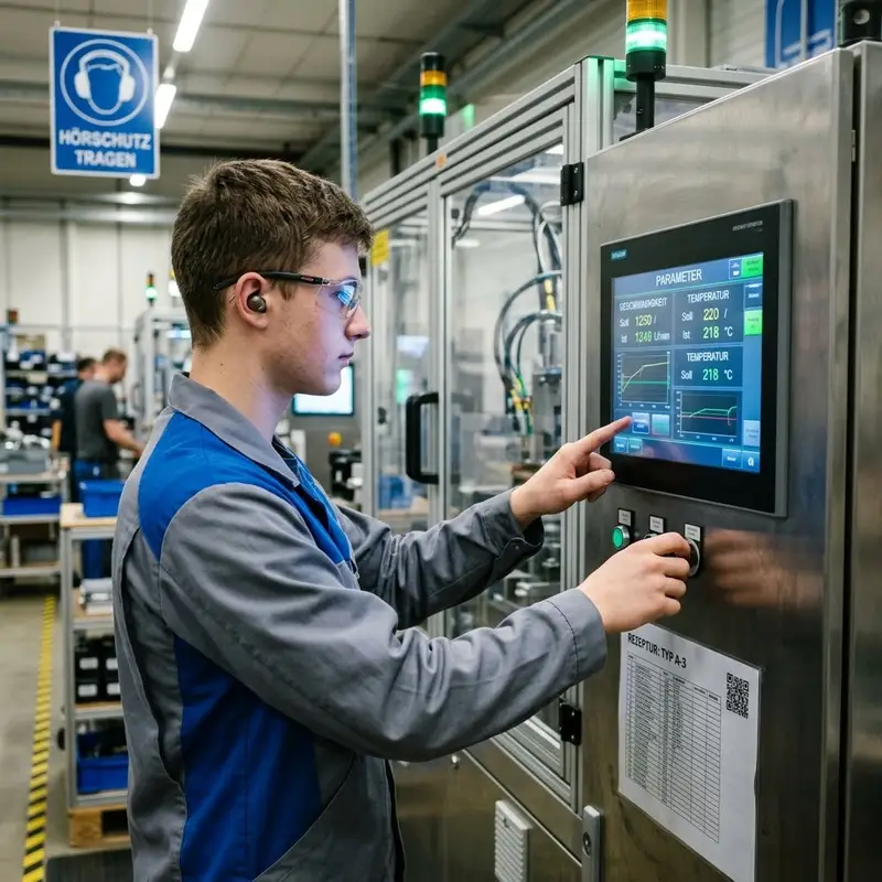 "description": "Du stellst an der Steuerung einer Maschine Geschwindigkeit und Temperatur über ein Bedienpanel in der Produktionsstätte ein.",