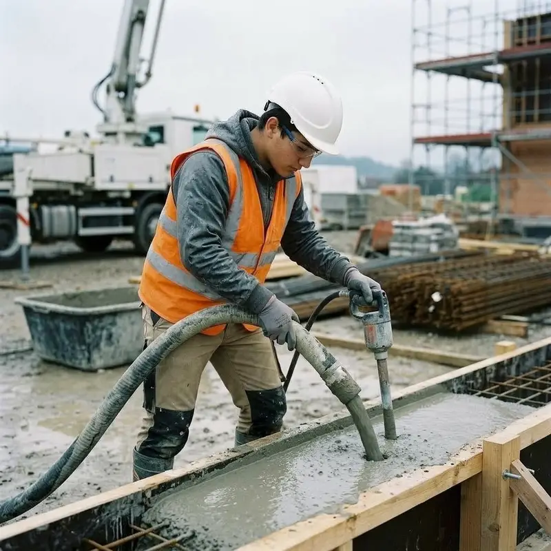 "description": "Du füllst Beton aus dem Kübel oder Schlauch in die Schalung und verdichtest ihn mit dem Rüttler auf der Baustelle.",