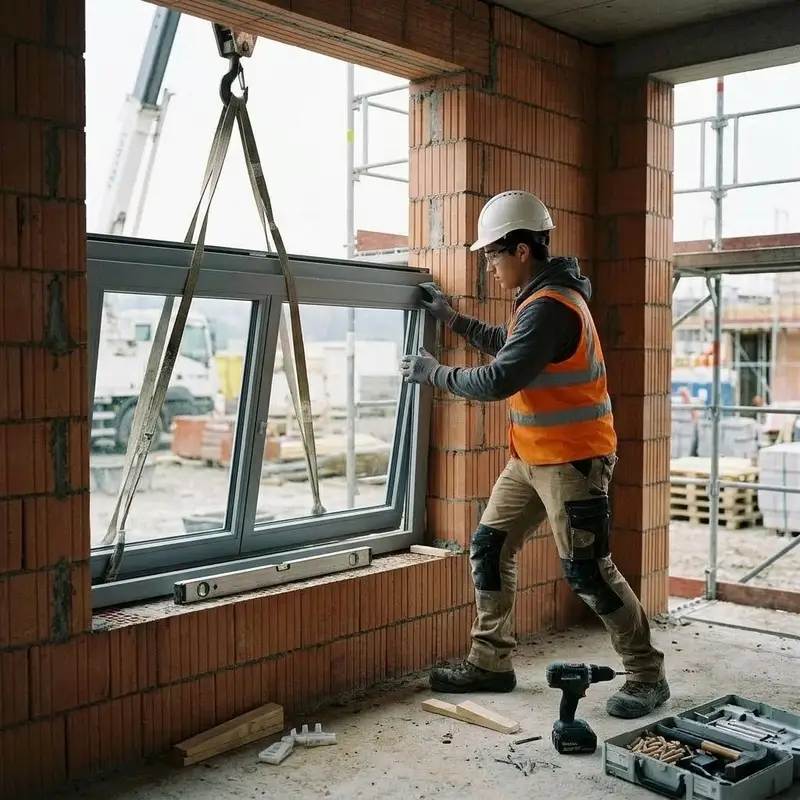 "description": "Du hebst mit dem Kran ein Fenster- oder Türelement in die Wandöffnung und befestigst es mit Dübeln und Schrauben.",