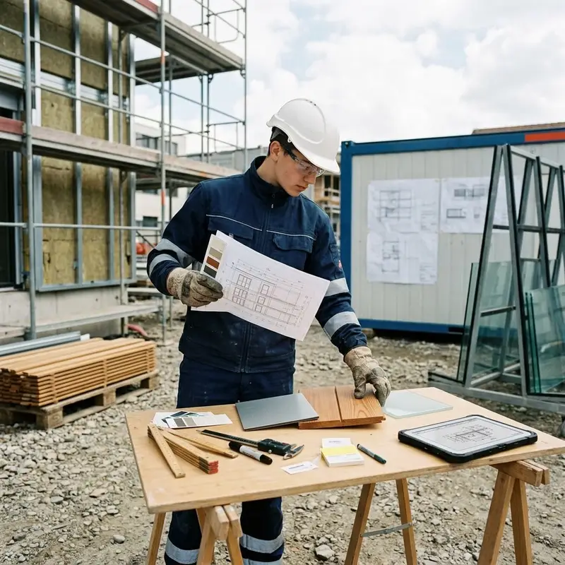 "description": "Du prüfst auf der Baustelle Pläne und Muster und wählst die passenden Fassadenmaterialien wie Holz, Metall oder Glas aus.",
