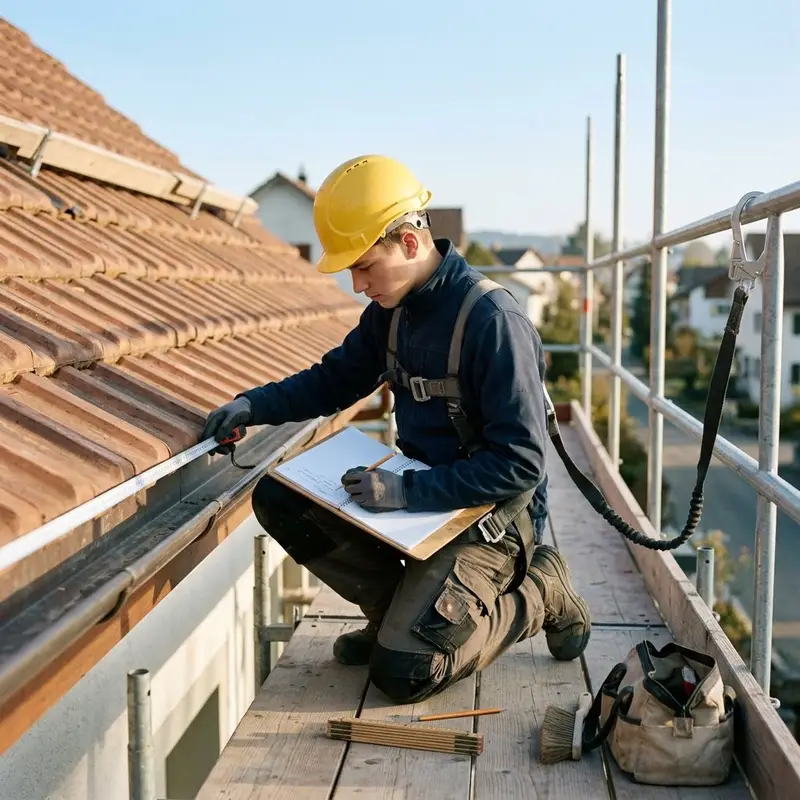 "description": "Du misst das Dach mit Massband und Notizblock auf dem Gerüst aus und markierst die wichtigen Masse.",