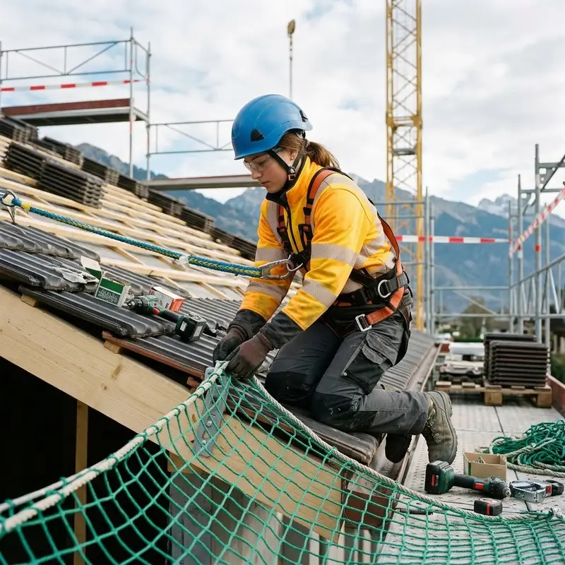 "description": "Du montierst Dachfangnetze und Sicherungsseile am Dachrand, während du Helm und Klettergurt trägst.",