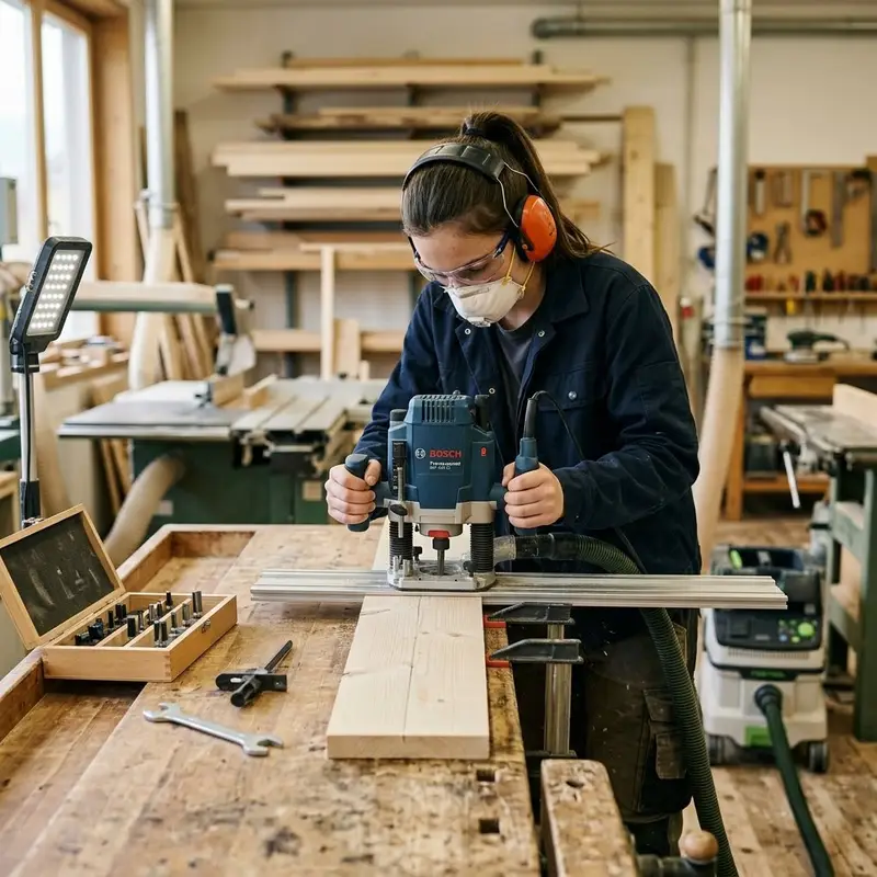"description": "Du fräst mit der Oberfräse Nuten oder Profile in ein Holzstück am Arbeitstisch.",