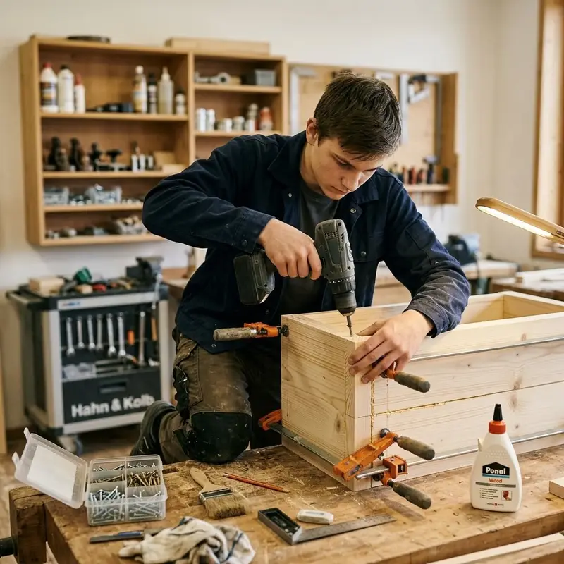 "description": "Du verschraubst und verleimst mehrere Holzteile mit Schraubzwinge und Akkuschrauber zu einem fertigen Möbelteil.",