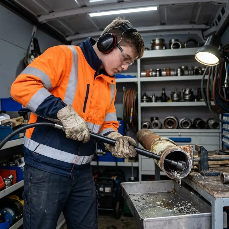 "description": "Du entfernst harte Kalkablagerungen in einem Rohr mit einer mechanischen Fräse im Werkstattwagen.",