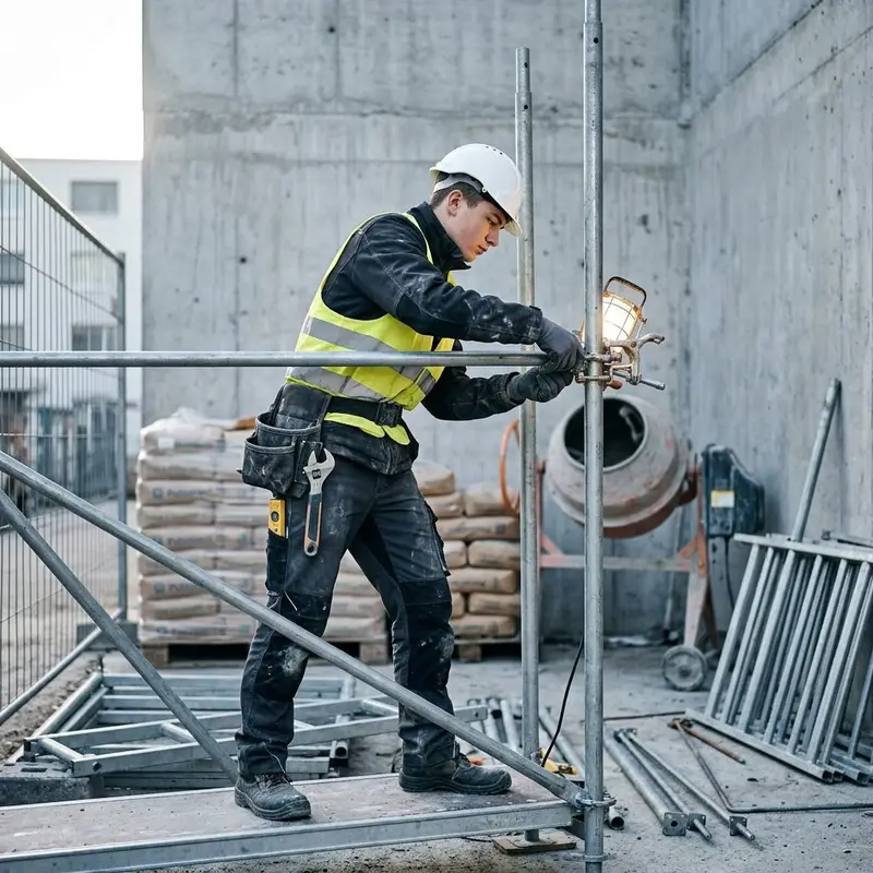 "description": "Du baust auf der Baustelle ein Arbeitsgerüst auf und sicherst es mit Geländern und Verankerungen.",