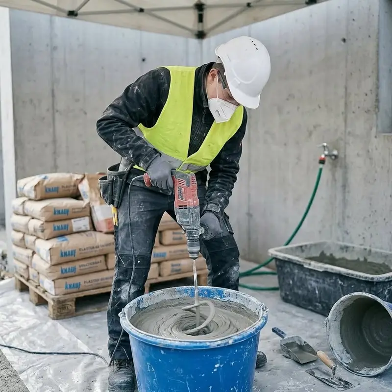 "description": "Du mischst im Eimer Gips mit Wasser und rührst ihn mit dem Rührquirl zur richtigen Konsistenz an.",