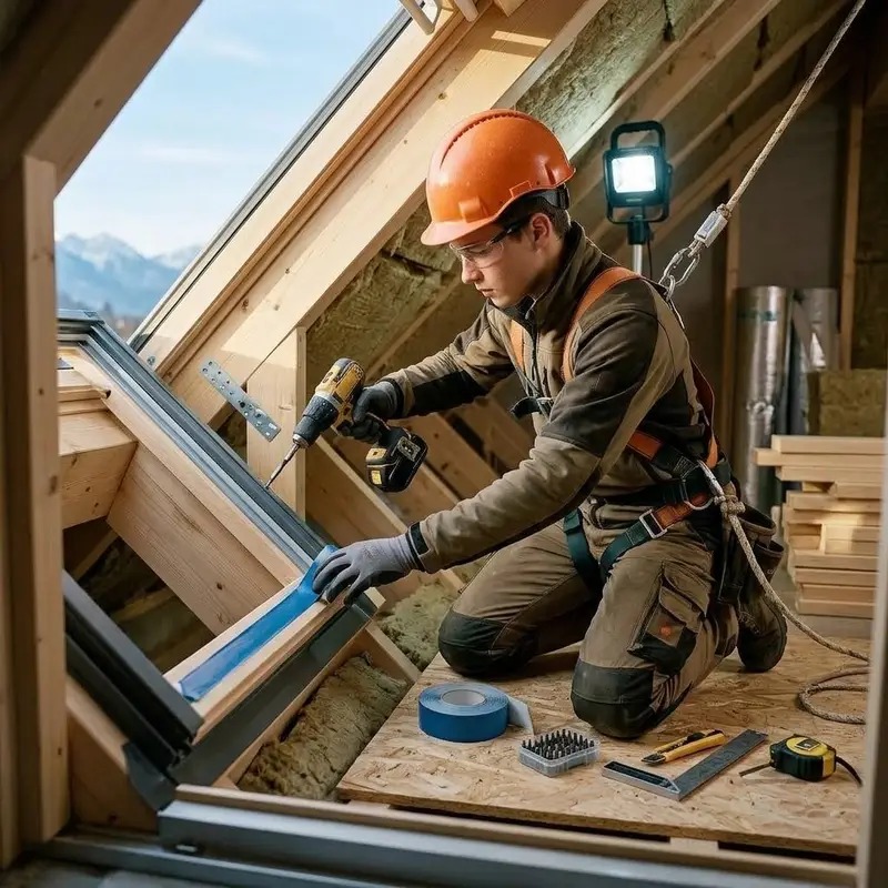 "description": "Du setzt mit Akkuschrauber und Dichtband ein Dachfenster in die vorbereitete Öffnung der Dachkonstruktion ein.",