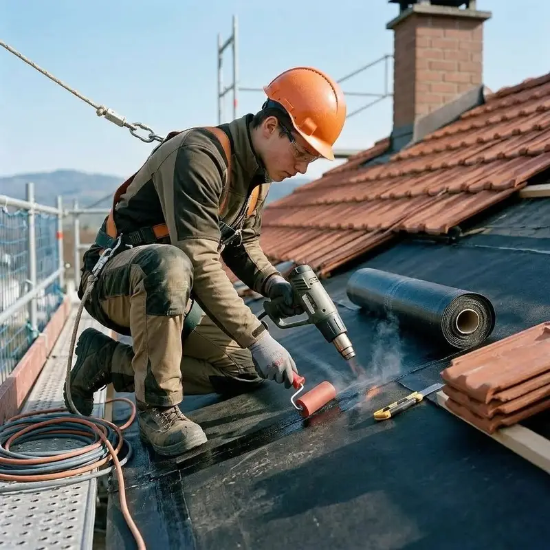 "description": "Du rollst die Dachbahn aus, verschweisst die Nähte mit dem Heissluftgerät und deckst danach die Fläche mit Dachziegeln ein.",